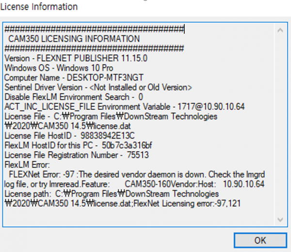 cam 350 주사용 PC의 전원 코드 분리하였었는데 이후 실행시 하기와 같이 서버끊김의